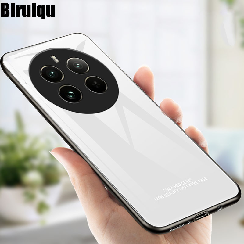 Biruiqu For Realme 12 Pro / Realme 12 Pro + Shockproof Tempered Glass Back Soft Silicone Edge Black Case Cover Casing